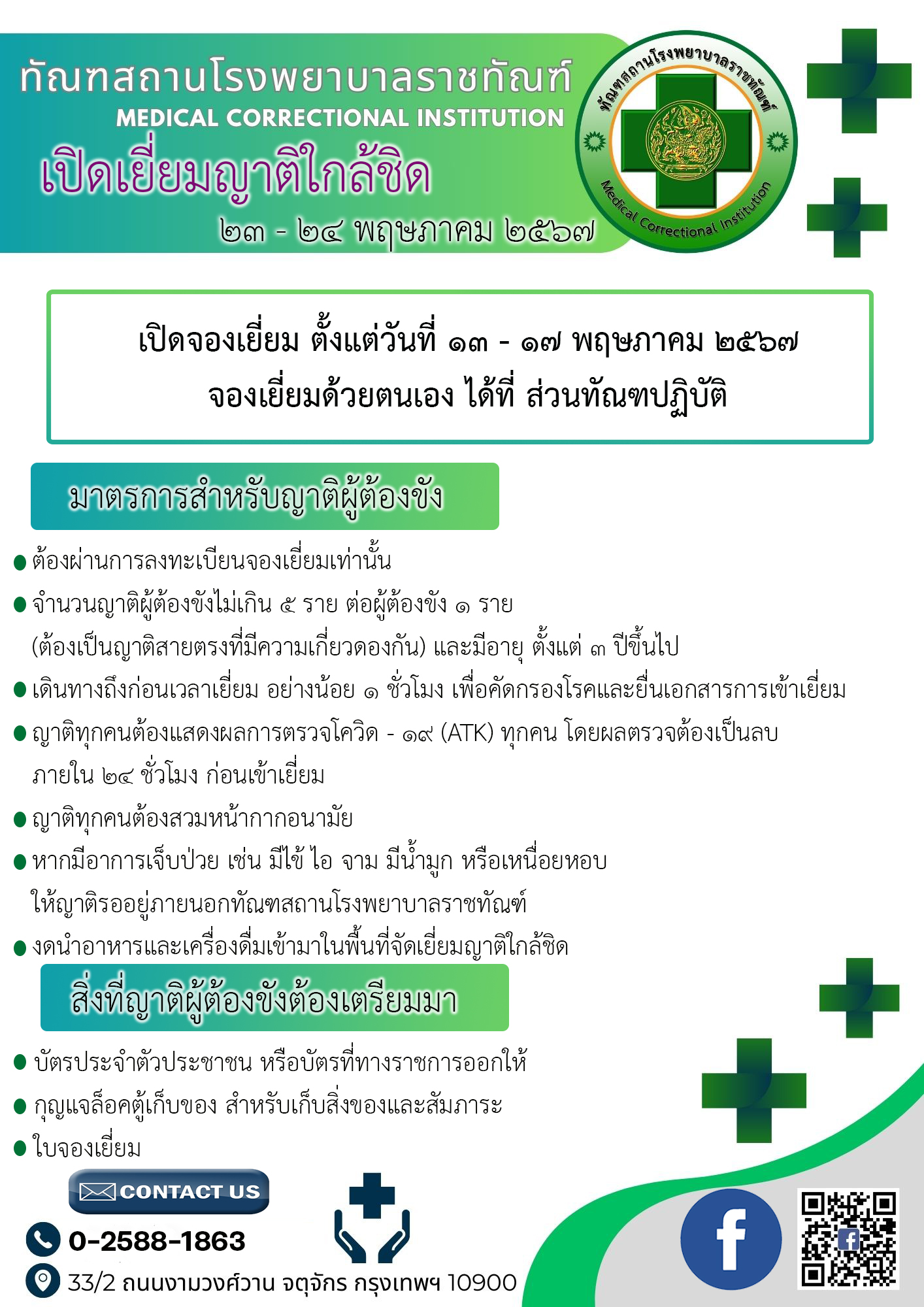 ทัณฑสถานโรงพยาบาลราชทัณฑ์เปิดเยี่ยมญาติใกล้ชิด 23-24 พฤษภาคม 2567